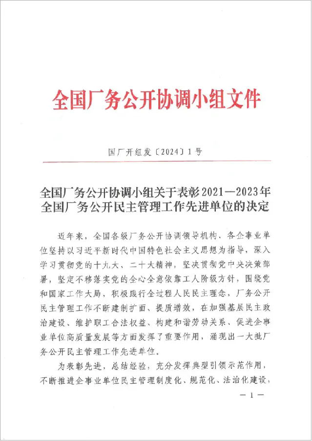 近日,全國廠務(wù)公開協(xié)調(diào)小組印發(fā)《關(guān)于表彰2021-2023年全國廠務(wù)公開民主管理工作先進(jìn)單位的決定》,江蘇鵬飛集團(tuán)股份有限公司被表彰為全國廠務(wù)公開民主管理工作先進(jìn)單位。