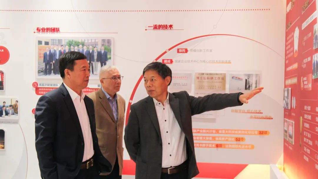 南通市委書記吳新明、海安市委書記譚真參觀鵬飛展示中心,董事長王家安向其介紹產(chǎn)品研發(fā)、生產(chǎn)銷售、國外市場拓展情況