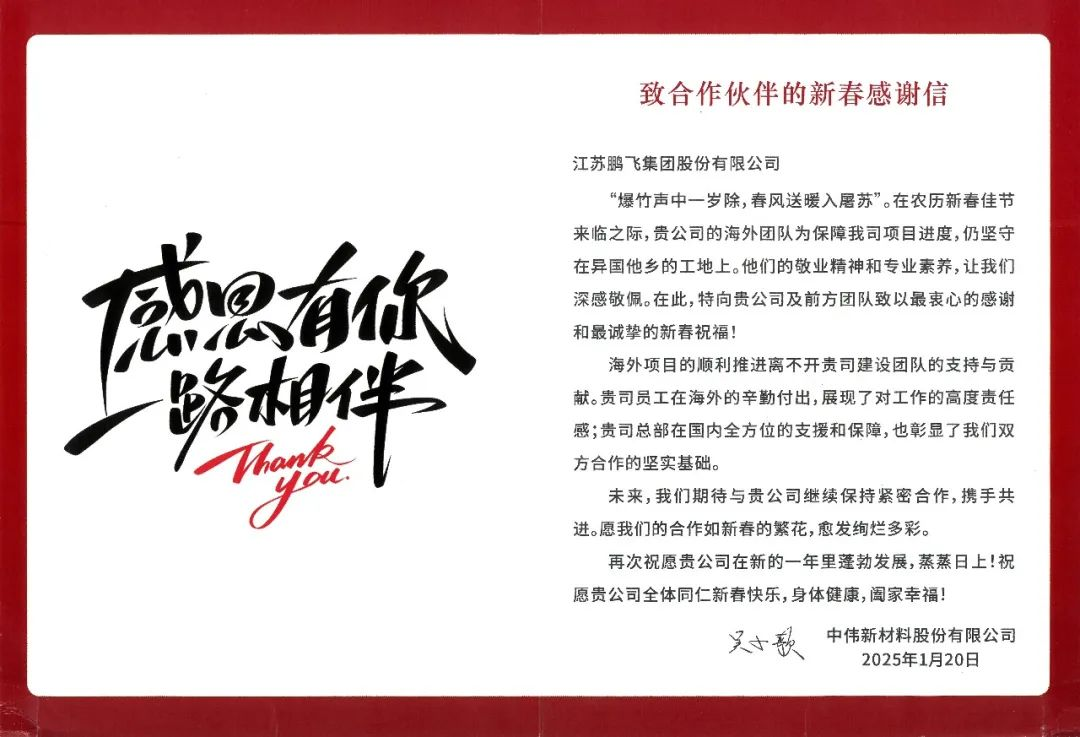 江蘇鵬飛集團在項目履約中用行動做到客戶滿意,以優(yōu)質履約作為品牌支撐,收到來自客戶的感謝信。信中,客戶對我司交付的項目質量和效率表達了高度肯定和認可,更對鵬飛項目負責團隊的認真負責態(tài)度、專業(yè)技術能力、高效執(zhí)行能力給予了高度的評價和贊賞。