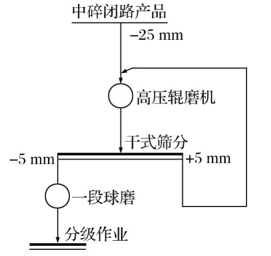 該鉬礦結(jié)合多年現(xiàn)場生產(chǎn)實(shí)踐,選取有代表性礦樣進(jìn)行試驗(yàn)。礦樣由硬礦、中等硬度礦和軟礦組成,根據(jù)地質(zhì)模型和采礦排產(chǎn)計(jì)劃,3 種礦樣按比例4∶4∶2 進(jìn)行配礦。對(duì)配好礦樣進(jìn)行 3 種高壓輥磨工藝流程的試驗(yàn)研究,獲得其產(chǎn)品粒度和邦德功指數(shù)參數(shù)。實(shí)驗(yàn)室采用 1 臺(tái) CLM25