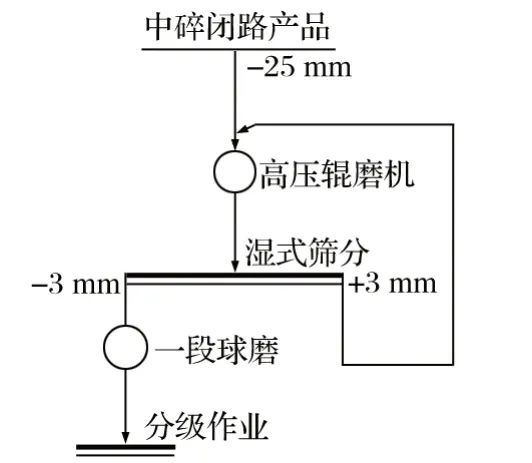 該鉬礦選礦廠從建成投產(chǎn)以來,處理礦石的性質(zhì)變化較大,經(jīng)常導(dǎo)致破碎和磨礦系統(tǒng)處理能力波動(dòng),當(dāng)處理難碎磨礦石時(shí),系統(tǒng)處理能力低,襯板磨損嚴(yán)重。借鑒其他鉬礦選礦廠技術(shù)改造的生產(chǎn)實(shí)踐經(jīng)驗(yàn),在三段一閉路流程后引入高壓輥磨機(jī)作為超細(xì)碎設(shè)備降低入磨粒度,提高系統(tǒng)整體碎磨能力。根據(jù)大量的文獻(xiàn)報(bào)道,有色金屬選礦廠高壓輥磨生產(chǎn)實(shí)踐選用3 種典型工藝流程,如圖 1~ 3 所示。結(jié)合本項(xiàng)目特點(diǎn),高壓輥磨機(jī)入料粒度為 -25 mm。