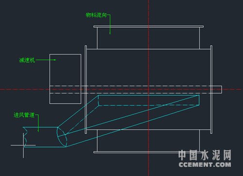 方案三:在鎖風(fēng)閥徑向位置安裝導(dǎo)風(fēng)管,無(wú)需再引出管路通到磨機(jī)。通方案二將窯尾熱風(fēng)通入鎖風(fēng)閥徑向?qū)эL(fēng)管中,由此來(lái)解決粘料問(wèn)題。后經(jīng)過(guò)驗(yàn)證,這種方法起到了很好的效果,不論是成本,還是空間結(jié)構(gòu),以及施工等方面都是最節(jié)儉的。(如圖二)