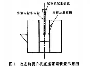 原來(lái)設(shè)計(jì)的配重裝置采用兩邊齒條,通過(guò)配重和下滾筒的自重進(jìn)行皮帶張緊,兩邊調(diào)節(jié)裝置同時(shí)調(diào)節(jié)皮帶的跑偏情況。從理論上講沒有問(wèn)題,但實(shí)際使用中皮帶兩邊跑偏嚴(yán)重,無(wú)法進(jìn)行調(diào)整,增大配重或偏向提升或下沉齒條都無(wú)法解決問(wèn)題。經(jīng)研究分析,我們將配重連接M32的絲桿,在導(dǎo)向板的下半部分設(shè)置調(diào)節(jié)裝置,解決了問(wèn)題。改進(jìn)前后見圖1、圖2。