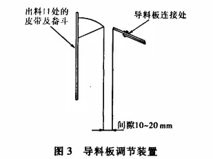 由圖3可見,間隙應(yīng)調(diào)整在10-20mm,不能太大,也不能太小。間隙太小,機(jī)組運(yùn)行時(shí),畚斗與導(dǎo)料板相碰,無(wú)法運(yùn)行。間隙太大,則回料太多,導(dǎo)致機(jī)組箱體內(nèi)堵料而停車。導(dǎo)料板系易損件,平時(shí)應(yīng)經(jīng)常檢查導(dǎo)料板的磨損情況,做到及時(shí)更換,并保證安裝牢固。