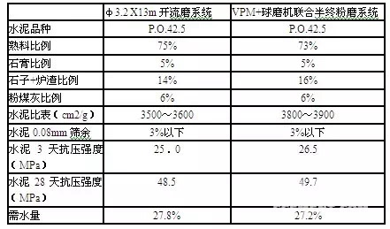 關(guān)于水泥質(zhì)量,我們與該廠(chǎng)老生產(chǎn)線(xiàn)(φ3.2 X13m開(kāi)流磨系統(tǒng))所生產(chǎn)的水泥進(jìn)行對(duì)比,結(jié)果如下: