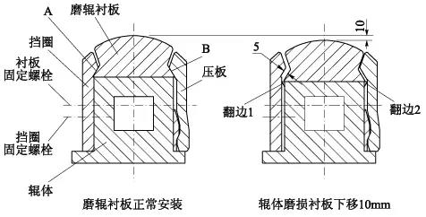 利用庫滿停機(jī)檢查,發(fā)現(xiàn)有一塊磨輥襯板的2條固定螺栓松動,緊固螺栓后用撬杠仍可以撬動襯板。此時分析認(rèn)為可能是這塊襯板與輥體接觸面處出現(xiàn)較大磨損、變形,襯板固定不牢固。用塞尺測量接觸面A、B處間隙,B處接觸面符合要求,A處有5mm間隙。拆開襯板后發(fā)現(xiàn),該襯板下面的輥體磨去10mm左右,輥體在靠擋圈側(cè)及壓板側(cè)分別形成寬約5mm及25mm的翻邊(見圖1中翻邊1及翻邊2)。其他11塊襯板及對應(yīng)的輥體正常。由上述檢查可知,輥體表面的磨損及翻邊造成了襯板固定不牢固。