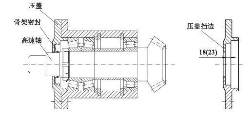 骨架密封厚度15mm,拆下壓蓋用車床將骨架密封擋邊車薄5mm,壓蓋密封槽深度由18mm加深到23mm(見圖4)。此法使得骨架密封在高速軸上的安裝位置向外移動5mm,避開高速軸上的溝槽。經(jīng)此處理,解決了漏油問題,可以正常生產(chǎn),等到計(jì)劃檢修停機(jī)時,再徹底處理高速軸上的溝槽。