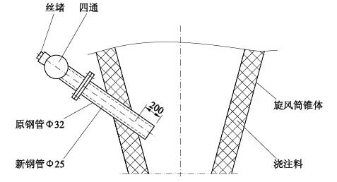 拆下四通及法蘭,在Φ32鋼管內(nèi)部套裝Φ25鋼管,Φ25鋼管上端與法蘭焊接,下端與原Φ32筒平齊(見圖5)。這樣處理后,預(yù)熱器C5B旋風(fēng)筒負(fù)壓正常。