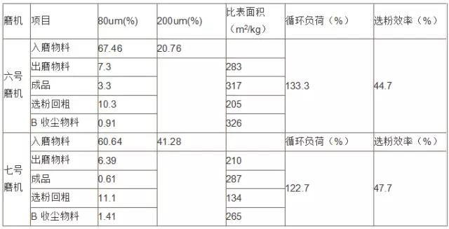 2、同時對六七號磨機(jī)的入磨物料、出磨物料、選粉機(jī)回粗、B收塵的物料、水泥成品、在磨機(jī)運(yùn)轉(zhuǎn)正常的情況下進(jìn)行取樣,做80um、200um、及比表面積以計(jì)算磨機(jī)的循環(huán)負(fù)荷和選粉機(jī)的選粉效率。測量結(jié)果見下表: