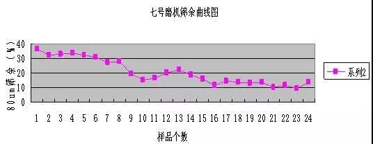 鑒于六七號磨機(jī)的狀況,我們對兩臺磨機(jī)停磨進(jìn)磨觀察,六號磨機(jī)內(nèi)兩倉料球比過高,進(jìn)磨后看不到鋼球,物料高出一個鋼球的高度,正常情況下鋼球應(yīng)該高出料面露出半個鋼球?yàn)樽罴眩S現(xiàn)場測量計(jì)算六號磨一倉填充率為28.7%二倉為29.0%;七號磨機(jī)進(jìn)磨觀察一倉鋼球露出料面一半,說明填充率應(yīng)該是可以的,測量計(jì)算一倉的填充率為31.2%二倉為29.2%;這種磨機(jī)的最佳填充率一倉為30%左右二倉為31%左右。隨取七號磨樣做了磨機(jī)的篩余曲線,磨機(jī)均采用急停的停磨方式,入磨共取樣品24個做80um和200um的篩余。見圖1。