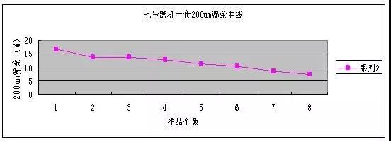 (1)從以上的兩個趨勢圖可以看出七號磨機(jī)的一倉粉磨能力還可以,特別是200um的篩余趨勢圖,篩余下降明顯。說明一倉鋼球級配和理粉磨能力正常。