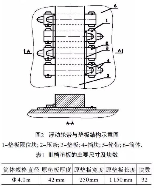 我公司生產(chǎn)的回轉(zhuǎn)窯采用浮動輪帶支撐窯筒體,輪帶是實心矩形斷面活套套在筒體上,加固窯筒體,見圖1。輪帶與筒體之間均勻分布著32塊墊板,避免輪帶內(nèi)表面與筒體外表面直接接觸。圖2為浮動輪帶與墊板結(jié)構(gòu)示意圖。表1為Ⅲ檔原墊板 的主要尺寸及塊數(shù)。在回轉(zhuǎn)窯運(yùn)轉(zhuǎn)過程中,筒體、輪帶和墊板之間留有一定的間隙。表2為輪帶內(nèi)徑與墊板外徑之間的間隙,這樣必然引起輪帶與筒體墊板之間產(chǎn)生滾動和滑移。我公司生產(chǎn)的回轉(zhuǎn)窯已運(yùn)轉(zhuǎn)僅年,墊板與輪帶內(nèi)圈均有不同程度的磨損,使輪帶起不到加固筒體作用,造成筒體橫截面變形增大,同時輪帶和墊板之間產(chǎn)生很大滑移,已超過極限值,致使限制輪帶軸向竄動的壓條頻繁被推掉。
