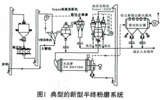 (4)隨著水泥粉磨工藝研究的不斷進(jìn)步,對(duì)傳統(tǒng)聯(lián)合粉磨系統(tǒng)的不斷優(yōu)化,“大輥壓機(jī)配小球磨機(jī)”的半終粉磨系統(tǒng)脫穎而出。與傳統(tǒng)聯(lián)合粉磨工藝系統(tǒng)相比,輥壓機(jī)半終粉磨工藝采用一臺(tái)物料處理能力較大的輥壓機(jī)和一臺(tái)喂料、分選能力大的下進(jìn)風(fēng)雙分離高效選粉機(jī),將V選后的細(xì)粉再次進(jìn)行分選,合格細(xì)粉從入磨前的物料中被分選出來并直接送入成品庫,中粗粉進(jìn)入球磨機(jī)進(jìn)行粉磨,大幅度提高了成品產(chǎn)量,改善了球磨機(jī)的工況,減少了過粉磨現(xiàn)象的發(fā)生。同時(shí)V型選粉機(jī)與雙分離高效選粉機(jī)共用一臺(tái)系統(tǒng)風(fēng)機(jī),取消了聯(lián)合粉磨系統(tǒng)中一臺(tái)循環(huán)風(fēng)機(jī)與旋風(fēng)收塵器及部分管道和輸送設(shè)備,進(jìn)而提高了球磨機(jī)的綜合臺(tái)時(shí)產(chǎn)量,降低了粉磨電耗,減少了設(shè)備數(shù)量和維修成本。典型的新型半終粉磨系統(tǒng)如圖1所示。