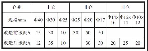 改造后磨機Ⅰ倉和Ⅱ倉仍然使用鋼球,Ⅲ倉使用微段。改造前后研磨體級配見表2。