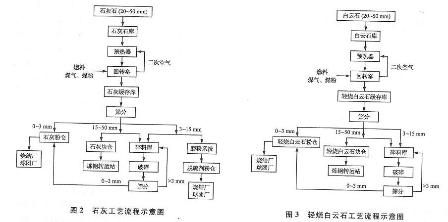 石灰工藝流程及輕燒白云石工藝流程詳見(jiàn)圖2和圖3。