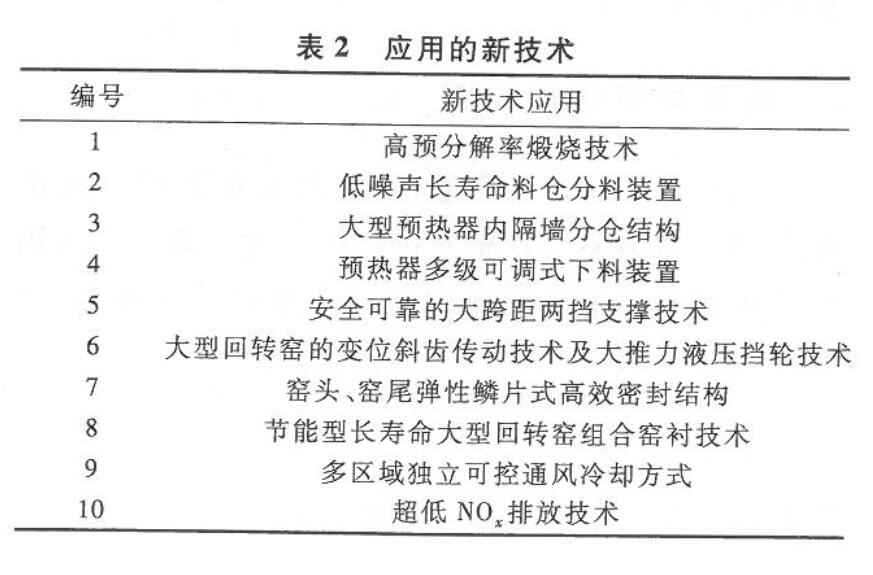 通過(guò)多年的自主研發(fā)和實(shí)踐經(jīng)驗(yàn)積累,我公司在本工程上應(yīng)用了大量的回轉(zhuǎn)窯新技術(shù),確保回轉(zhuǎn)窯系統(tǒng)的節(jié)能、環(huán)保、高效。具體應(yīng)用的新技術(shù)列于表2。