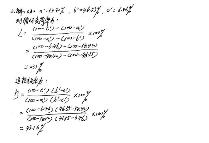 2、磨機(jī)正常運(yùn)轉(zhuǎn)后,分別在出磨斜槽、粗粉斜槽及細(xì)粉斜槽各取5個樣,其0.08mm篩孔平均篩余分別是34.42%,46.55%,6.46%,求其循環(huán)負(fù)荷率和選粉效率。