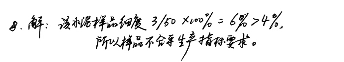 8、某廠水泥樣品50g,經(jīng)0.08mm方孔篩篩析,達(dá)到規(guī)定時間所剩料量為3g,問該樣品是否合乎生產(chǎn)指標(biāo)要求?(要求水泥細(xì)度<4%)
